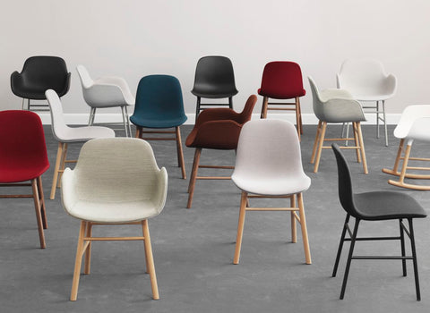 Normann Copenhagen brengt met Form een tijdloze collectie. Het onderstel van de stoel sluit naadloos aan op de kunststof zitting in verschillende kleuren. Het design van Simon Legald vormt één geheel en verzoent een sterk historisch design met innovatieve technieken. Het meest Scandinavische model heeft eikenhouten poten en een witte kuip. Maar bekijk zeker ook de variant met stalen poten of informeer naar de mogelijkheden om de zitting te stofferen.