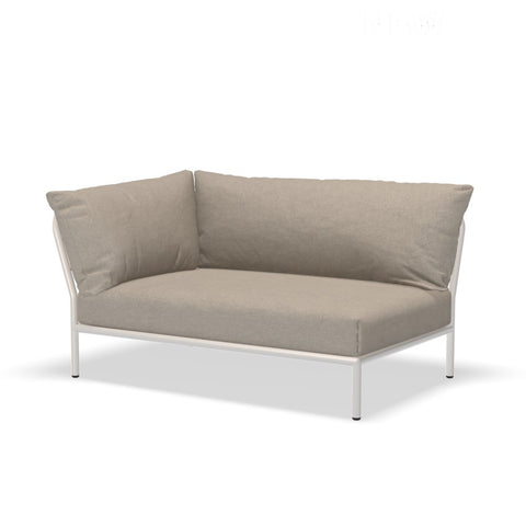 De Level 2 lounge sofa van het Deense merk Houe combineert een lichtgewicht frame uit aluminium met zachte, grote kussens. Het contrast zorgt voor een opvallend en uiterst comfortabel design. De modulaire collectie bestaat uit een hoekmodule (links of rechts), chaise longue, loungestoel en poef. Je kan de elementen los van elkaar gebruiken of tegen elkaar schuiven. Met nog twee formaten van houten bijzettafels, op talloze manieren te combineren voor een persoonlijke invulling. Beschikbaar in geselecteerde stoffen en kleuren waaronder de Sunbrella Heritage collectie.